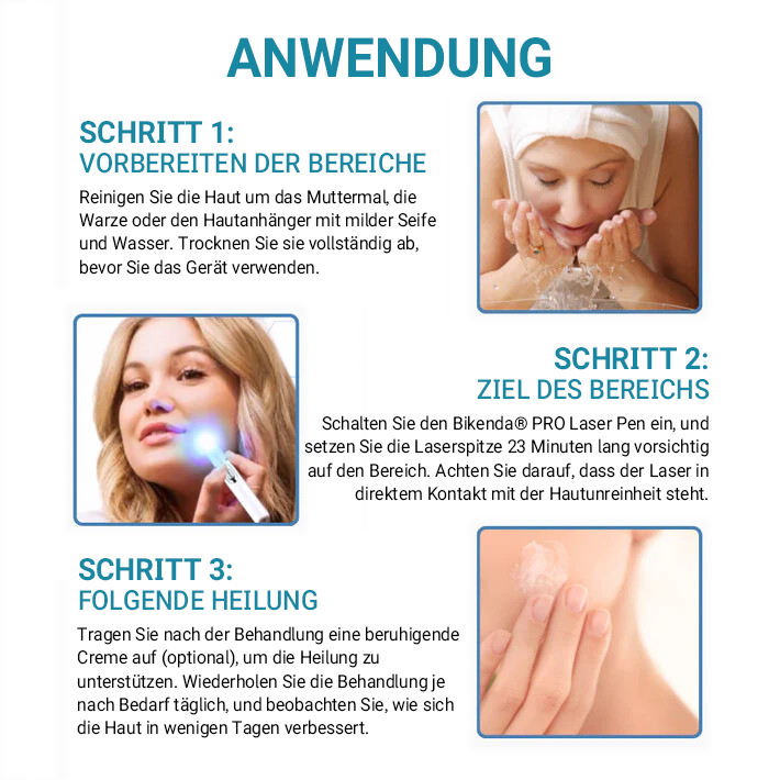 "Ich hatte einen kleinen, aber lästigen Hautausschlag an meinem Hals, der immer durch meine Halskette gereizt wurde. Ich habe den Bikenda® PRO Laser Pen nur ein paar Tage lang benutzt, und er ist eingetrocknet und vollständig abgefallen! Keine Schmerzen, keine Narben, und meine Haut sieht wieder glatt aus. Sehr zu empfehlen!"